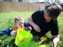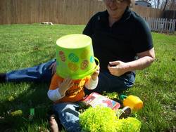 On Easter, Grandma goo-goo :) came over and tried to get me to eat Peeps. Have you had those things? Seriously, who thought they should sell those as edible!? YUCK! Then I played with some eggs and a chocolate rabbit. Silly rabbit. Ultimately though, I think I had the most fun with a bucket on my head. "Where's Cohen?" they say. Duh I'm right there under the bucket.