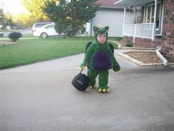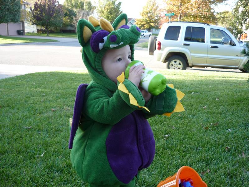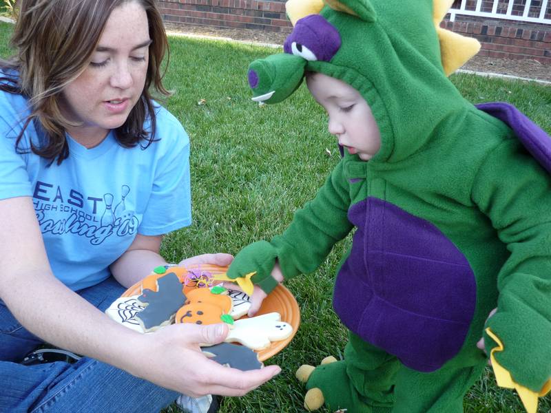 Barney?! Don't you dare call me Barney. I could whip that big goof ball. I'm a DINOSAUR, RAWRRR! Since I couldn't walk door to door to door and collect a bunch of candy I couldn't eat, we had all the family come see me :) We have them trained so well.